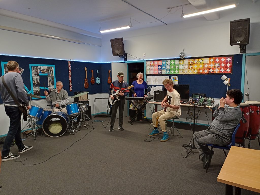 Welcome to our two new music therapy students, Rachel and Max, who enjoyed rocking it out with the music group today.