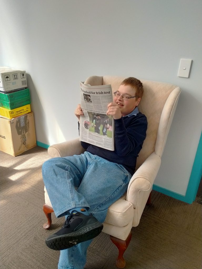 Chilling out in the General Manager’s office reading the sports news – Andrew loves his rugby!