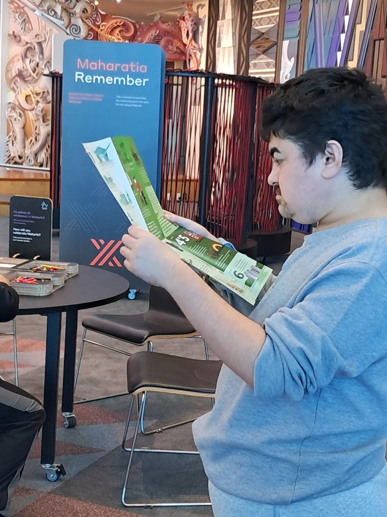 There is always lots of things to do at Te Papa – Bryce enjoyed reading the pamphlets.