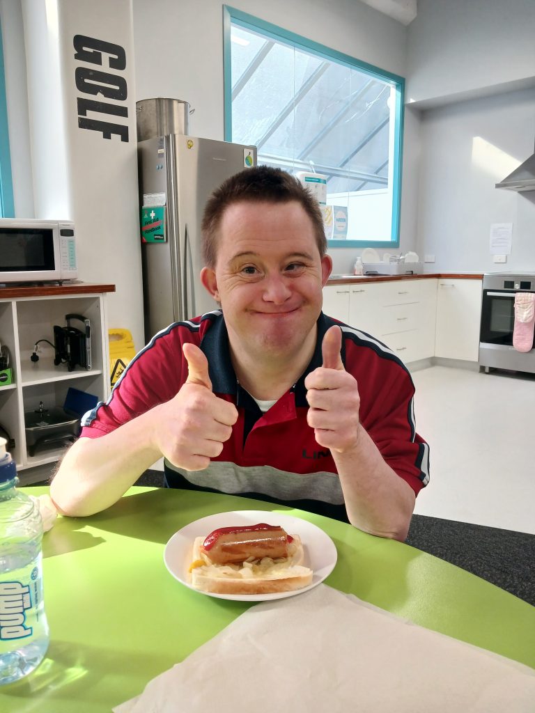 Tim enjoyed the indoor sausage sizzle at Evaro.